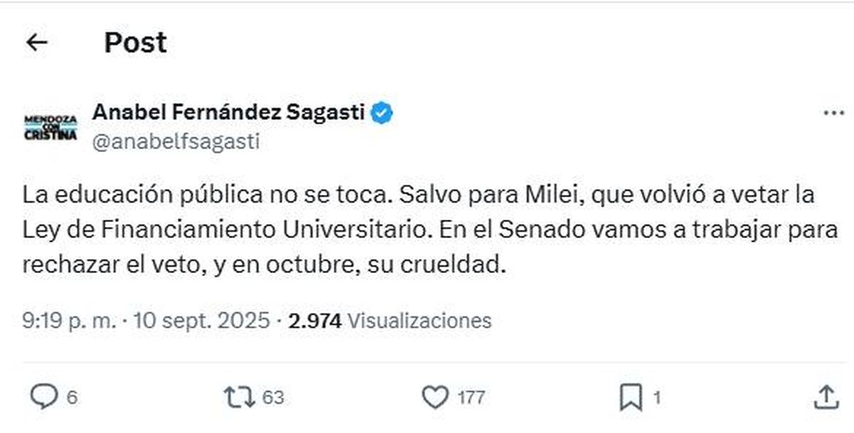 «La educación pública no se toca. Salvo para Milei, que volvió a vetar la Ley de Financiamiento Universitario. En el Senado vamos a trabajar para rechazar el veto, y en octubre, su crueldad», advirtió la legisladora nacional.